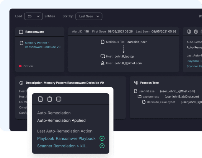 Cynet 內建端點防護平台 (Endpoint Protection Platform)、端點偵測與回應 (Endpoint Detection and Response)、裝置控制與行動、新世代防毒引擎 (NGAV) 等,隨選即用,無需額外整合,全面提供工作站、伺服器與行動裝置面對惡意程式、勒索軟體等各類網路威脅所需之進階防禦。