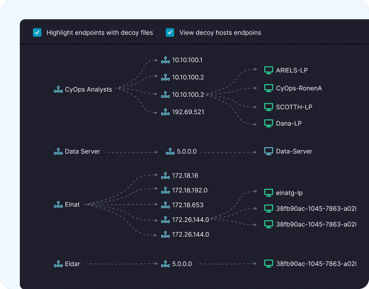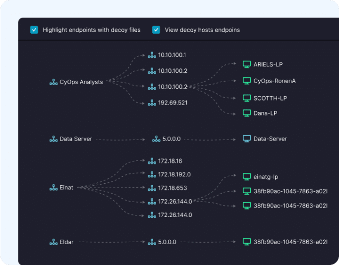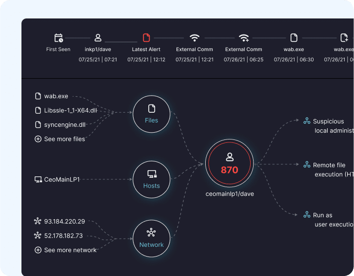 Cynet 內建使用者行為分析 (User Behavior Analytics)、欺敵誘捕技術 (Deception Technology) 及惡意網域過濾功能 (Domain Filtering),可即時偵測並阻擋內部惡意行為與帳號異常活動,防範帳號遭入侵、權限濫用等資安風險,隨選即可部署,無需額外設定。