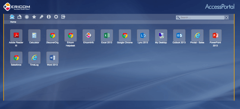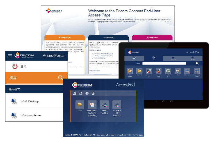 Ericom提供各類設備裝置優質且直覺化的使用者遠端連線操作體驗,包括PC、Mac、Chromebook、iPad/iPhone、Android、RIM Playbook 平板電腦/黑莓機、精簡型電腦,甚至locked-down devices等,並提供免費專屬的行動裝置連線軟體AccessToGo。
