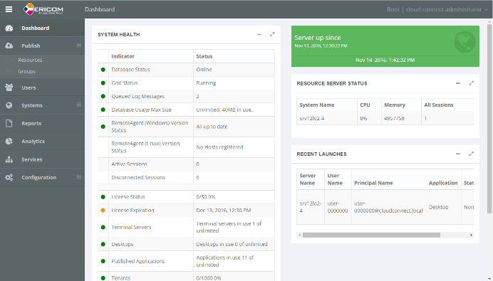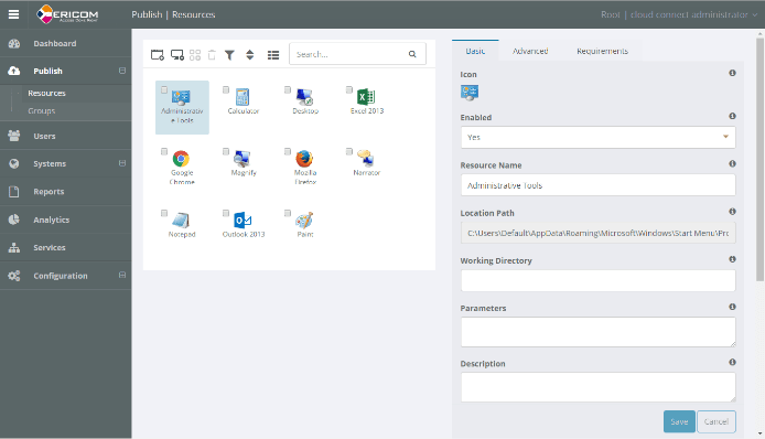 Ericom Connect® 直覺化、拖曳式的Web-Based 管理介面,具同質解決方案十倍的管理能力,可集中建置、 發佈並監控所有系統元件,無需安裝或設定任何管理套件。可配置、客製化與監看所有已發佈的應用程式、虛擬桌面與文件