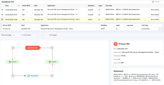 顯示由 MS SQL Server 自動選擇終止(Victim)的交易與存活的交易,有助於分析應用程式層錯誤處理邏輯。