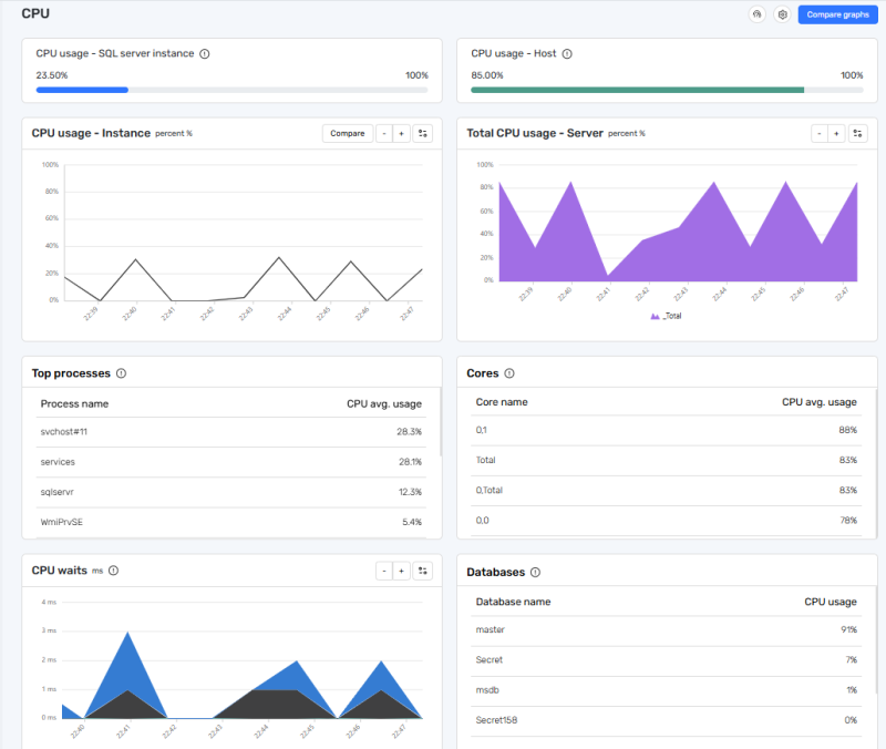 顯示總體CPU使用率、個別 Instance 之CPU使用率,以及各個處理器核心之使用狀況,亦列出耗用最多CPU資源之作業系統處理程序與MS SQL Server工作執行緒。