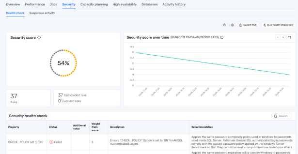 依據多項系統與 MS SQL Server 設定檢查結果,自動計算加權平均安全分數,幫助IT團隊快速評估資安狀態。