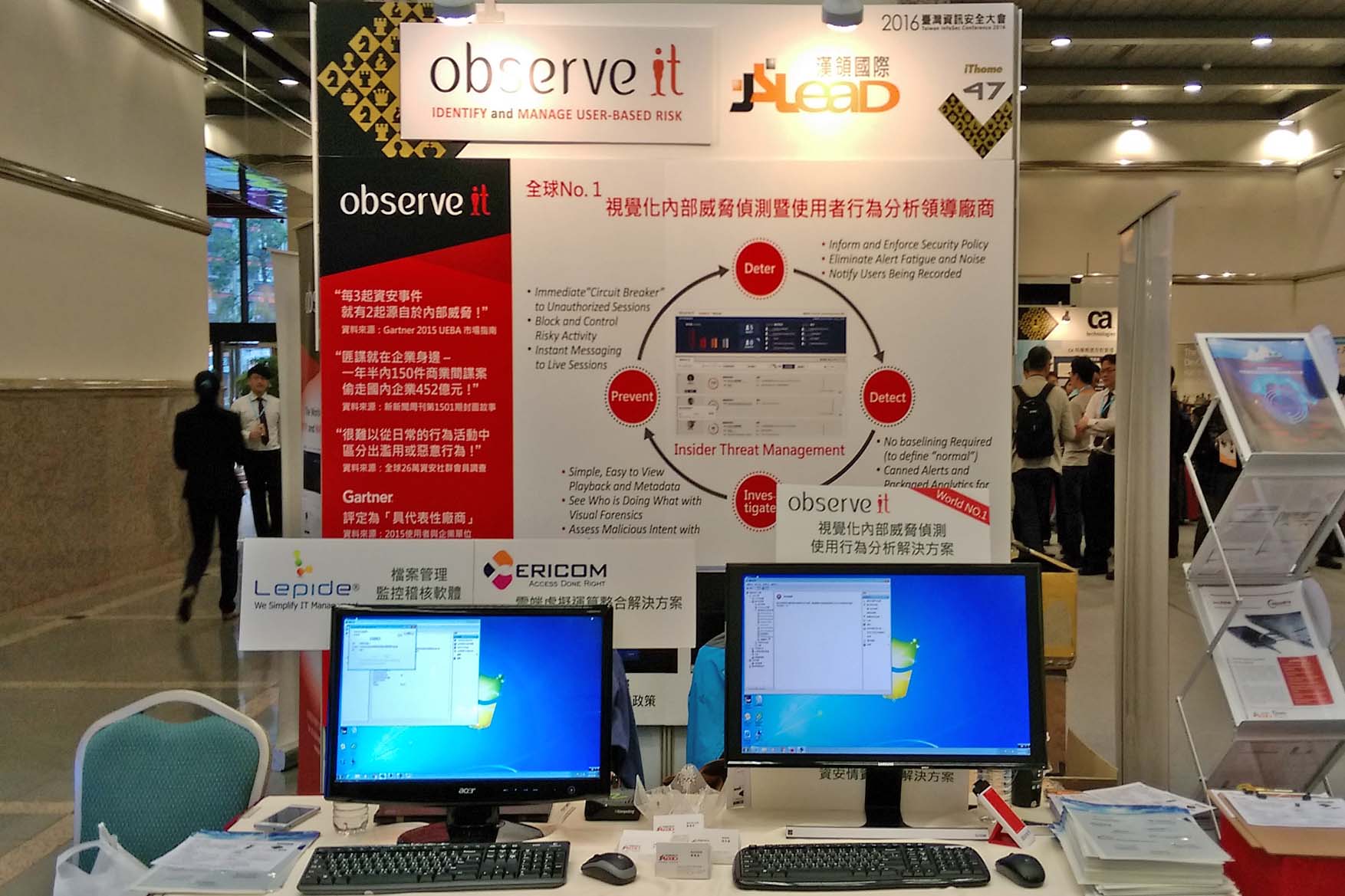 ObserveIT展示攤位吸引大批與會者關切,主因是ObserveIT 2015年第4季推出之V6版本,已由單純的側錄監控軟體成功進化為「視覺化內部威脅偵測使用行為分析解決方案」,具備內部威脅進階分析能力,可快速偵測內部潛在的使用者風險活動,進一步辨識蓄意或濫用行為,藉由預測風險進而達到資料外洩阻絕,做到事前偵測阻絕、事中蒐證回應、事後稽核舉證全程資安管理。ObserveIT新推出的In-App Element自訂欄位分析側錄技術,全面解決自行開發或套裝應用程式無法提供Log之技術瓶頸,而中斷與阻絕機制更可落實資安政策宣導與強制執行。