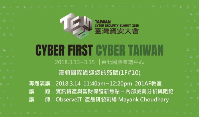 iThome所主辦之「2018臺灣資安大會」將於2018年3月13-15日假台北國際會中心舉行。漢領國際於本屆躍升為大會白金級贊助廠商,於1樓 #10攤位,展示國內各產業當下最迫切需要的資安威脅整合解決方案,以ObserveIT加強內部威脅使用行為分析與端點防護,再以LogRhythm進行整體資訊生態系統AI與關聯性的智慧型資安情資數據即時分析與威脅生命週期管理,並採用最新推出的Ericom Shield進行網站存取虛擬隔離與檔案淨化,同時以Datablink作行動裝置的進階身分認證機制,以強化連線存取安全。