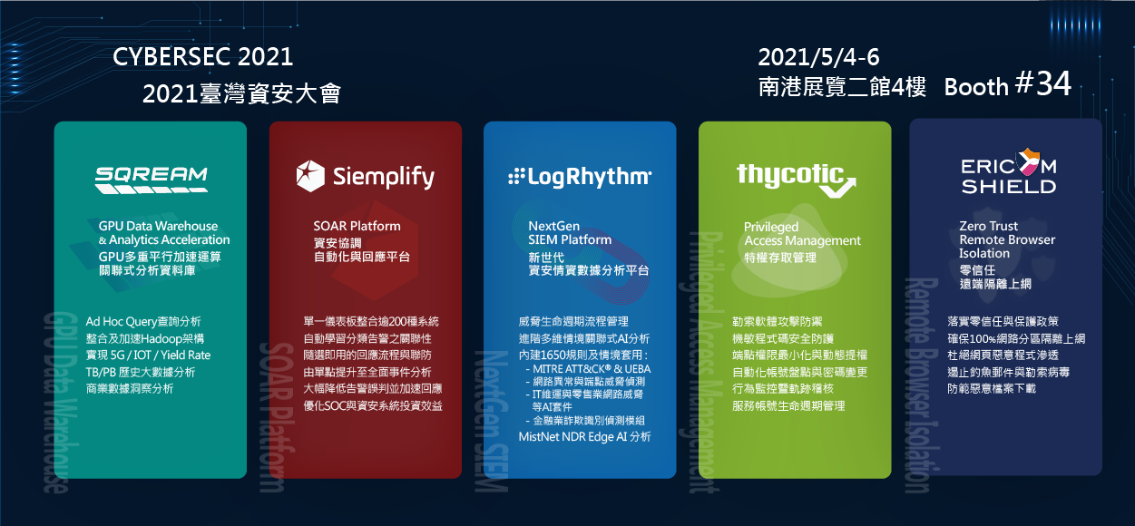 iThome 所主辦之「CYBERSEC 2021 臺灣資安大會」即將於 2021 年 5 月 4 - 6 日假南港展覽館二館舉行,漢領國際於 4 樓 B34 攤位,整合展示符合國內產業需求的各面向資安解決方案。資安產品技術總監黃漢宙將連續三天於現場進行兩個時段【與時俱進的「Zero Trust & Protection」資安策略「立竿見影 & CP值」為上的資安佈署】專題議程,涵蓋 Gartner魔力象限領導品牌:LogRhythm NextGen SIEM、Thycotic PAM與Ericom Shield RBI 精粹解析,期待您的蒞臨。