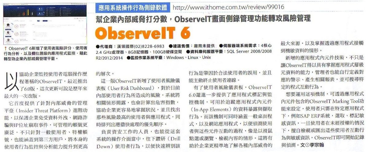 【2015年10月09日--台北訊】iThome電腦報第732期「 幫企業內部威脅打分數,Observe IT畫面側錄管理功能轉功風險管理」