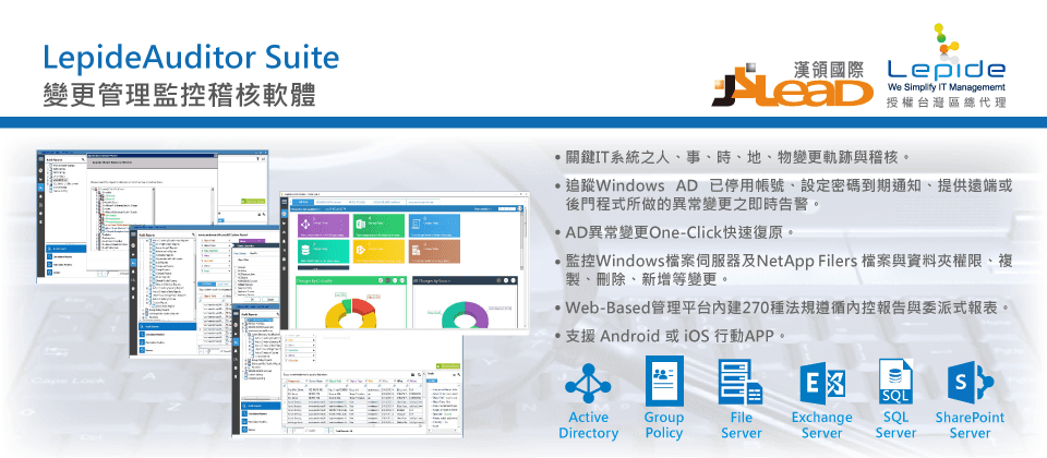 【2016年6月16日,台北訊】專業資安解決方案代理商 - 漢領國際今天正式宣佈取得技術獨步全球的Lepide變更管理監控稽核軟體台灣區總代理,將銷售Lepide各系列產品,而LepideAuditor Suite更因技術與價格之雙重優勢,未正式推出前已受市場關切。LepideAuditor Suite具備進階完整功能、操作維護簡易、深具成本效益,擁有高相容性之變更管理監控稽核解決方案,能針對Active Directory、Group Policy、Exchange、SQL Server、SharePoint與File Server提供人、事、時、地、物等關鍵變更相關資訊。