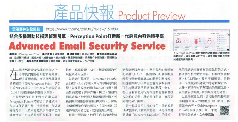 【2022年6月4日--台北訊】iThome 電腦報第1080期「結合多種輔助技術與偵測引擎,Perception Point 打造新一代惡意內容過濾平臺 Advanced Email Security Service」