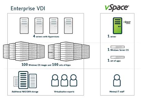 NComputing vSpace™ Pro Enterprise 虛擬桌面技術能讓多達 100 位使用者同步存取同一個 Windows 或Linux 作業系統,並針對虛擬桌面之建置進行最佳化,因此,vSpace™ Pro Enterprise 能夠與以 VMware、Microsoft Hypervisor 或 Citrix 為基礎的虛擬伺服器環境進行整合,並輕鬆地將傳統的一對一虛擬主機結構擴充為 100 位使用者同步對應單一虛擬作業系統,進而強化了上述虛擬軟體的應用價值,不僅大幅提升營運效能,更可立即降低 IT 管理維護的支出、以及汰換電腦設備的採購成本。
