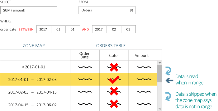 SQream DB 執行時會以data skipping 技術忽略 query 用不到的資料,像是 RAM, PCIe, GPU, Disk 及網路等,以減少不必要的存取動作所導致的系統資源耗費,進而使運算效能極致發揮。SQream DB 具備專利技術於 data ingestion 時進行資料結構優化,同時記錄資料值的範圍及其他屬性以作為 metadata,以利 query 查詢時的效能極大化。