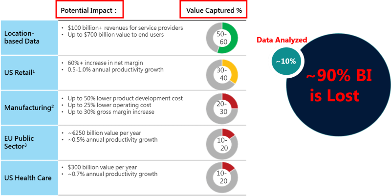 企業組織之數據資料正以指數級速度成長,而傳統 CPU-based 資料倉儲與分析系統,有高達90%的數據價值尚未被充分發揮,面對動輒以 Terabyte 為計的巨量資料時更顯得左支右絀,Cubing、Pre-computation、Indexing 等繁瑣冗長的資料準備作業,不僅造成數據資料分析結果緩不濟急且錯失先機,更易造成有形的商業損失。