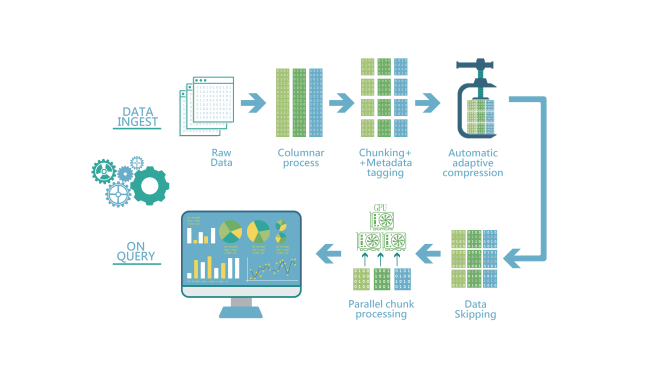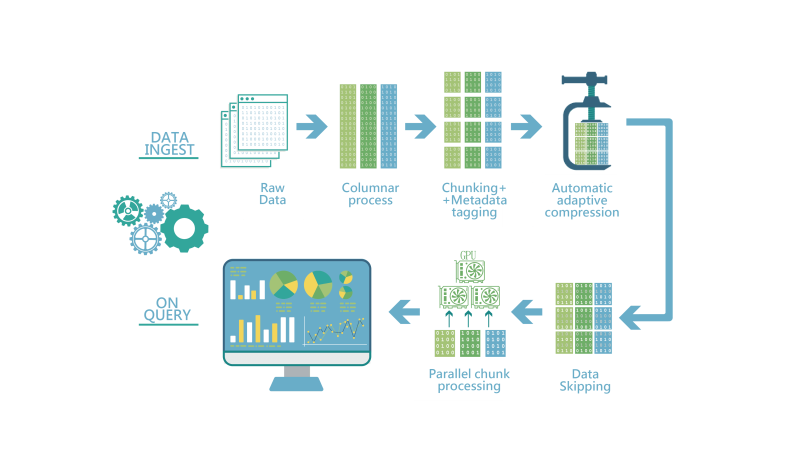 SQream DB 於 GPU 中將 Raw Data 進行資料 Columnar、Chunking、Compression、Data Skipping 與 Parallel Chunk Processing 自動化處理 ,無需諸多中間資料準備過程即可直接自動優化分析巨量資料。