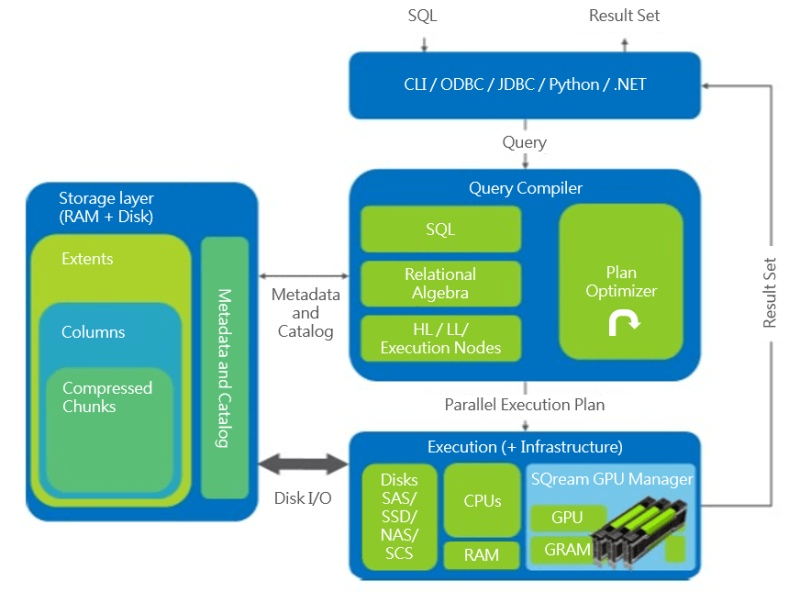 SQream DB 可以結合 CPU、GPU、RAM、Storage 各種既有系統資源,以最佳效能因應各種作業需求變動